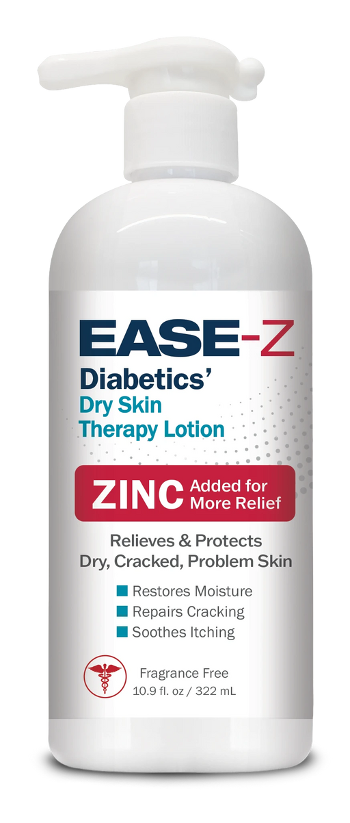 Developed to meet the specific needs of diabetic skin, EASE-Z Dry Skin Therapy Lotion uses the power of ZINC to give a strong protective barrier and help heal minor sores and wounds. The addition of Shea Butter and Lecithin gives rich moisturization and helps repair the discomfort of dry, cracked, itchy skin. Apply to skin for non-greasy, long-lasting hydration. Long-lasting moisture Strong protective barrier Fragrance-free ALL DAY MOISTURE WITH ZINCGives long-lasting protection to dry skin and helps the healing of minor sores and wounds. ADDITIONAL MOISTURIZERS GIVE MORE RELIEFFormulated with Shea Butter, Lecithin, and Glycerin to deliver deep hydration. POWERFUL OVER-THE-COUNTER DRUG FORMULAActive levels of ZINC and Dimethicone add extra layers of effective skin protection. SHEA BUTTER GIVES RICH MOISTURIZATIONWith skin nourishing benefits, Shea Butter helps relieve the discomfort of dry, cracked, itchy skin. LECITHIN KEEPS MOISTURIZERS IN THE SKINWorks to help other ingredients go deep into the skin to give lasting relief. EASE-Z Diabetics’ Dry Skin Therapy Lotion gives powerful results and requires no prescription. Size(s): 10.9oz Active Ingredients: Zinc Acetate .25% and Dimethicone 3% Additional Ingredients: Water, Caprylic/Capric Triglyceride, Glycerin, Emulsifying Wax NF, Gyceryl Stearate, Polyacrylamide and C13-14 Isoparaffin and Laureth-7, Shea Butter, Sunflower Lecithin, Sodium Coco PG-Dimonium Chloride Phsophate, Phenoxyethanol, Ethylhexyglycerin, Tocopherol.
