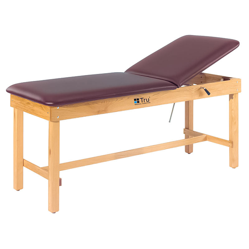 La mesa de tratamiento TruMedical Deluxe de roble cuenta con un soporte en forma de H, patas con pernos triples, bordes ranurados, espuma de densidad media de 2" y 13 opciones de color. Se ofrece con una sección de respaldo elevable opcional. Dos longitudes de mesa para elegir (72 o 78 pulgadas).