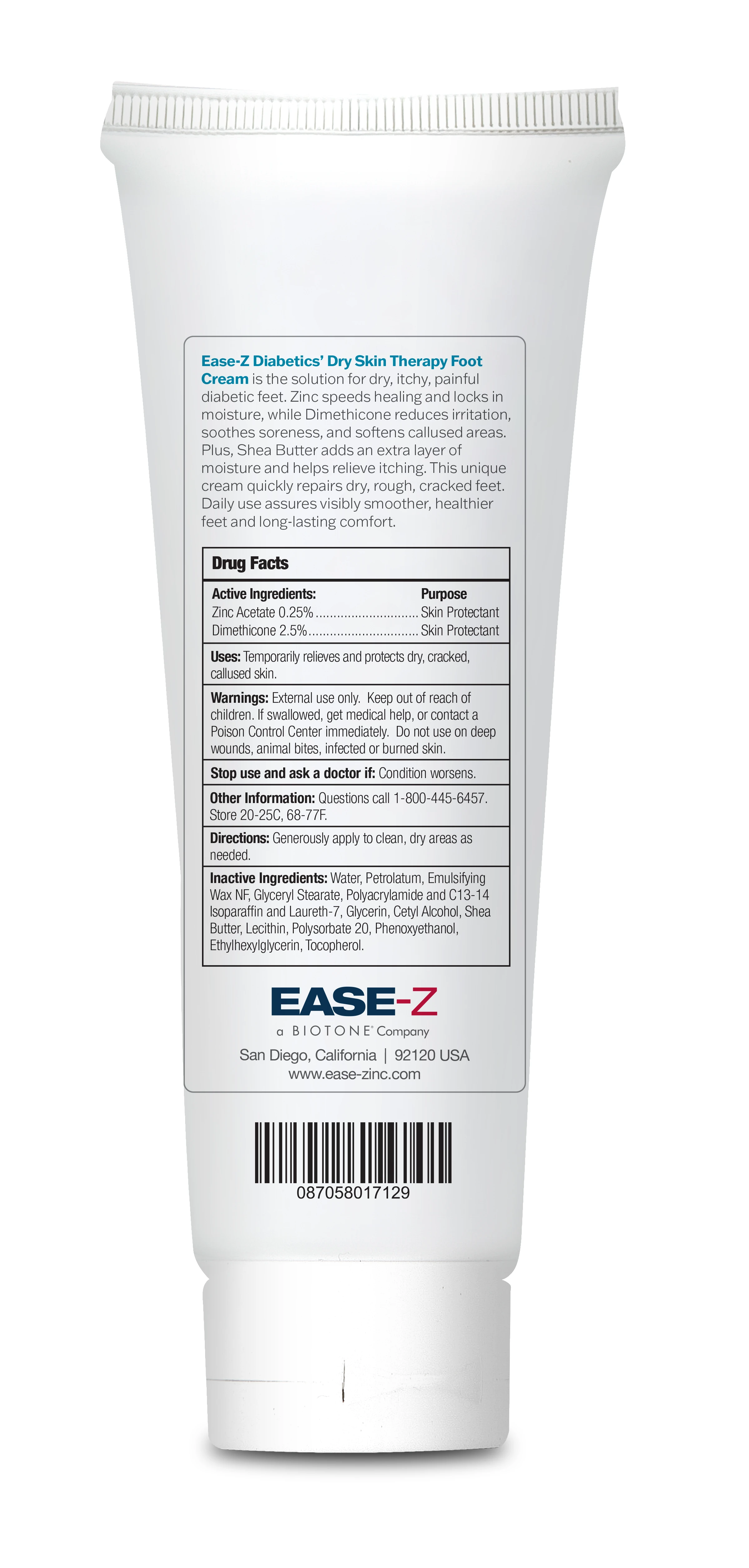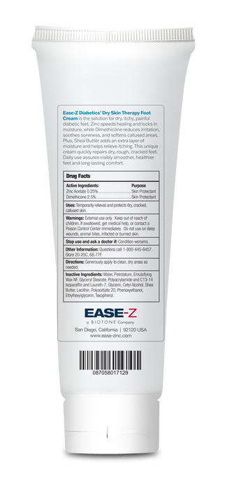 Developed to meet the specific needs of diabetic feet, EASE-Z Dry Skin Therapy Foot Cream uses the power of ZINC to give a strong protective barrier and help heal minor sores and wounds. The addition of Shea Butter, and Lecithin gives deep moisturization and helps repair the discomfort of dry, cracked, itchy feet. Apply to feet to replenish vital moisture and soothe problem feet.