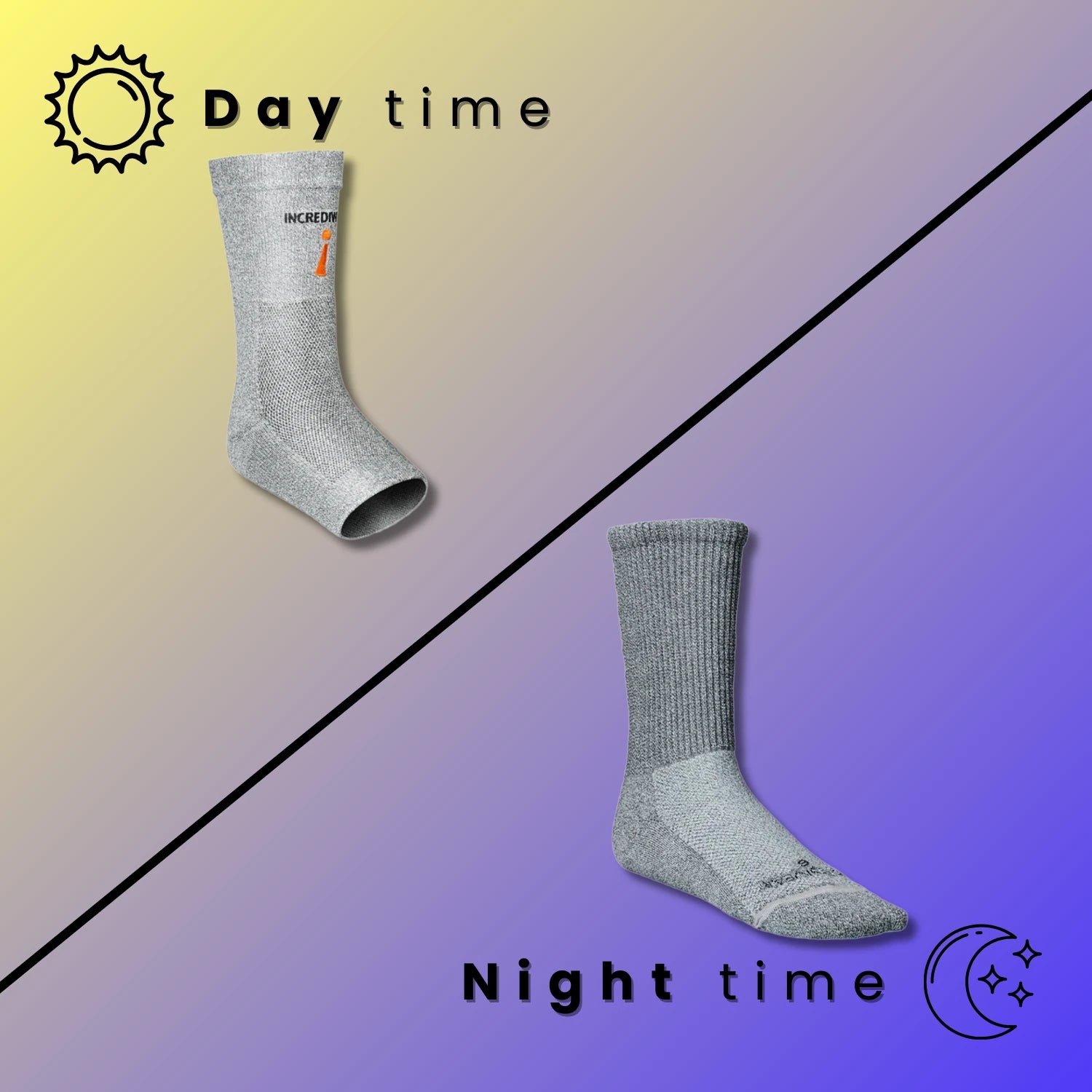 The Incrediwear Ankle Circulation Bundle pairs the Ankle Sleeve with the Crew Circulation Socks to provide comprehensive relief and recovery for the foot and ankle. The Ankle Sleeve delivers targeted support to reduce swelling, relieve pain, and restore mobility, while the Circulation Socks improve overall blood flow with a comfortable, non-binding fit that avoids the tightness of traditional compression socks.